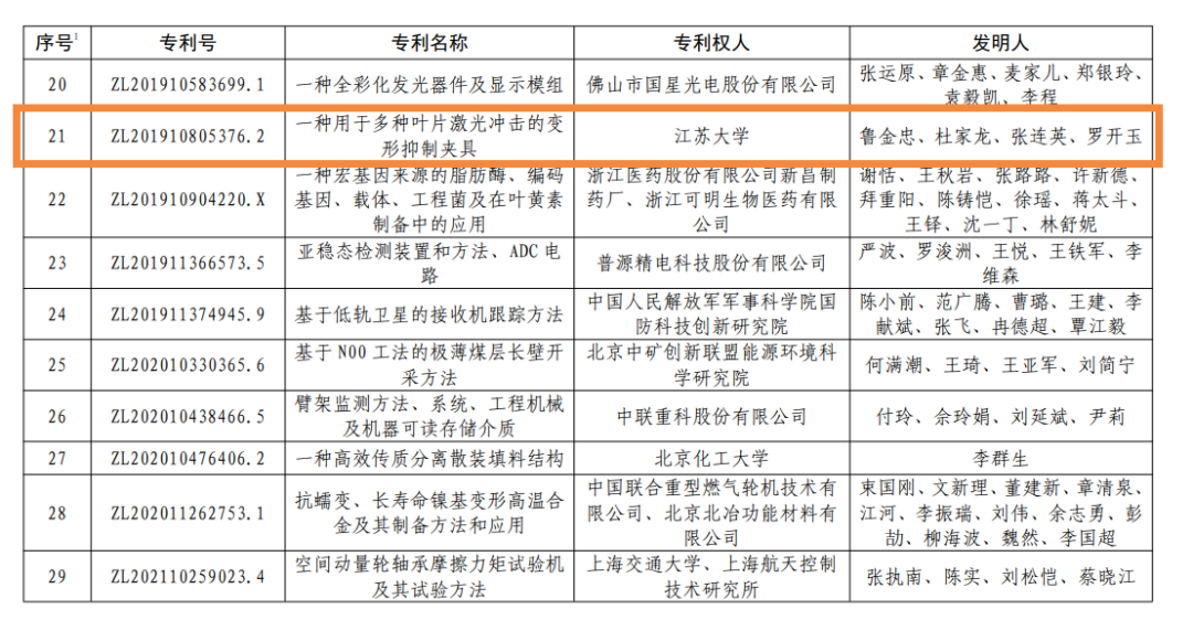 近日,国家知识产权局发布第二十四届中国专利奖授奖决定,开运体育平台官方网站专利“一种用于多种叶片激光冲击的变形抑制夹具”(专利号ZL201910805376.2)喜获中国专利金奖。此次共有83所高校获得中国专利奖,获金奖的高校仅有5所,其中西安交通大学有2个项目获得金奖,浙开运(中国)学、上海交通大学、北京化工大学和开运体育平台官方网站各有1项金奖。