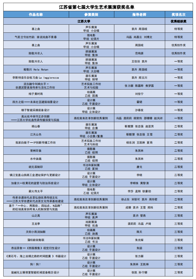 近日,江苏省教育厅正式公布江苏省第七届大学生艺术展演活动获奖名单,我校荣获特等奖2项、一等奖8项、二等奖11项、三等奖8项,2项原创作品荣获优秀创作奖,学校荣获“优秀组织奖”,获奖总数和一等奖获奖率均创历史新高。
