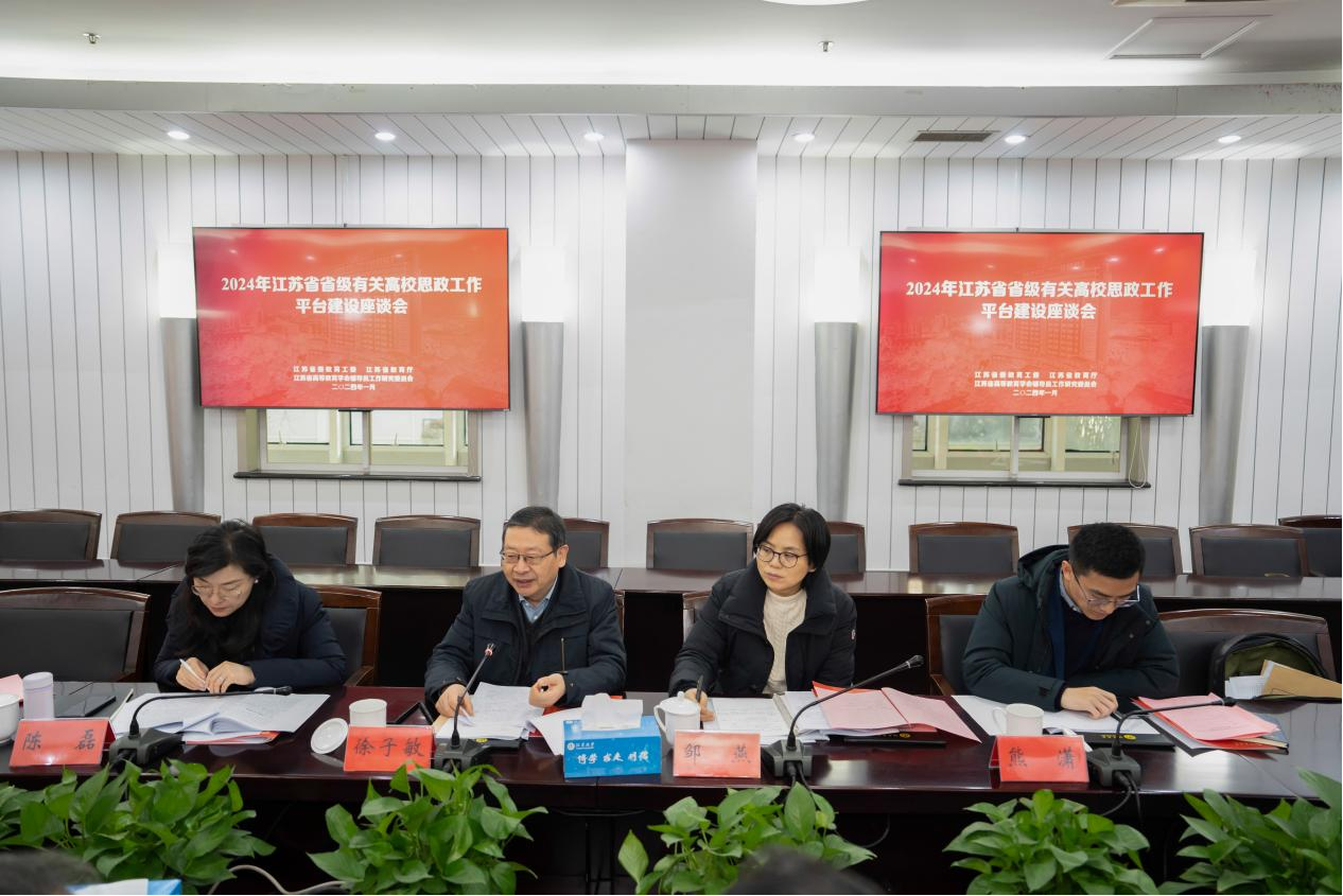 1月25日,2024年江苏省省级有关高校思想政治工作平台建设座谈会在我校举行。省教育厅一级巡视员徐子敏,南京工业大学党委常委、副校长刘大卫,苏州大学党委常委、副校长查佐明,南通大学党委常委、副校长吉明明,开运体育平台官方网站党委常委、副校长任旭东,南京师范大学党委常委、宣传部部长宋喆,省教育厅社政处处长邹燕、一级主任科员陈磊、挂职干部熊潇,以及省网络思政中心(易班中心)、8个省级高校辅导员培训与研修基地负责人参加座谈会。