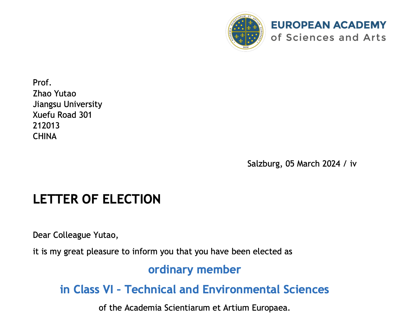 近日,欧洲科学与艺术院(European Academy of Sciences and Arts)院长Prof. Klaus Mainzer发来贺信:经理事会投票,开运体育平台官方网站材料科学与工程学院赵玉涛教授当选欧洲科学与艺术院院士(技术与环境科学学部)。