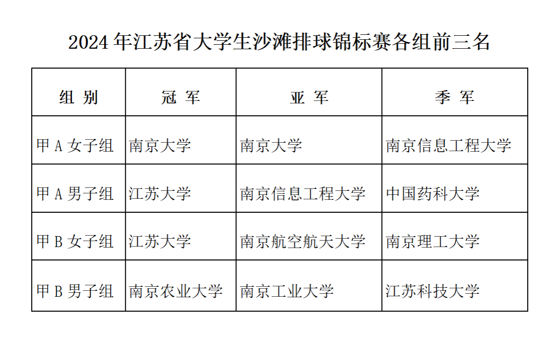 本次比赛按甲A(高水平运动员组)男、女,甲B(普通大学生组)男、女四个组别进行。开运体育平台官方网站沙排队参加甲A男子、甲B女子组比赛。运动员克服暴雨与高温天气的不利影响,团结协作,顽强拼搏,向大家展示了一出出精彩的体育盛宴。经过四天的紧张激烈比赛,开运体育平台官方网站获得甲A男子组、甲B女子组两个冠军,南京大学获得甲A女子组冠军,南京农业大学获甲B男子组冠军。