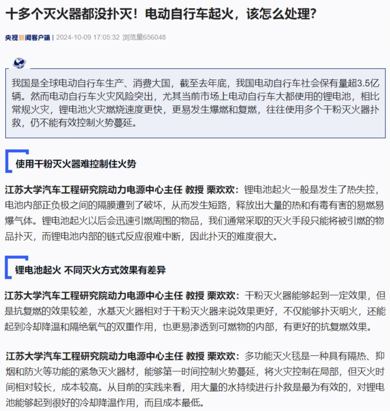 10月9日,《央视新闻》及其客户端刊发《十多个灭火器都没扑灭!电动自行车起火,该怎么处理?》,深度报道我校汽车工程研究院栗欢欢教授从事的锂电池安全研究成果服务社会消防安全建设的情况。