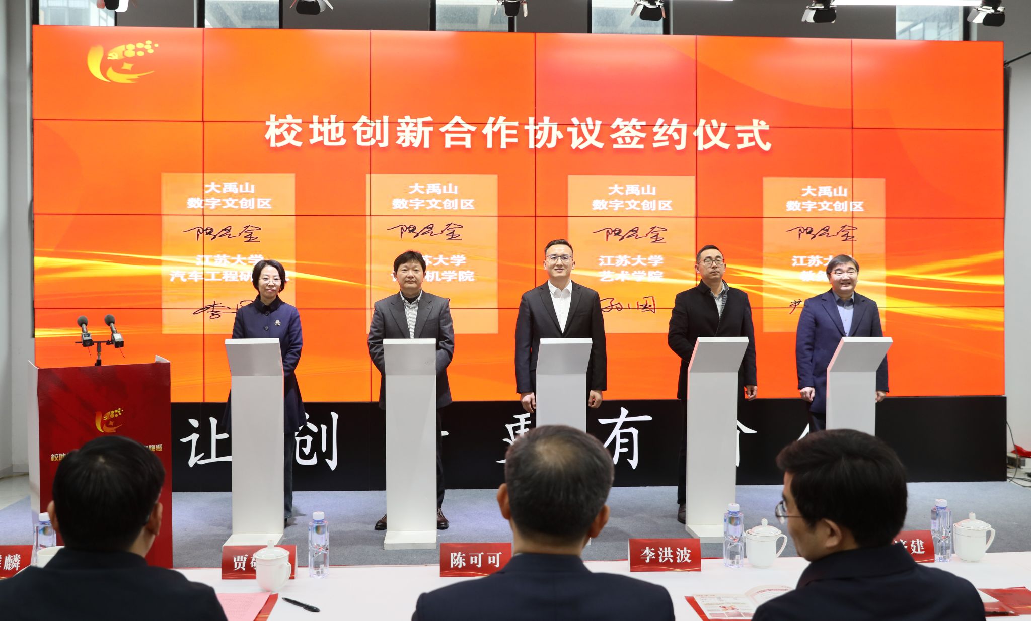 教务处、艺术学院、计算机学院、汽车工程研究院与大禹山数字文创区签订校地创新合作协议,学校10名统战成员负责的项目签约入驻京鸥新“智”空间。