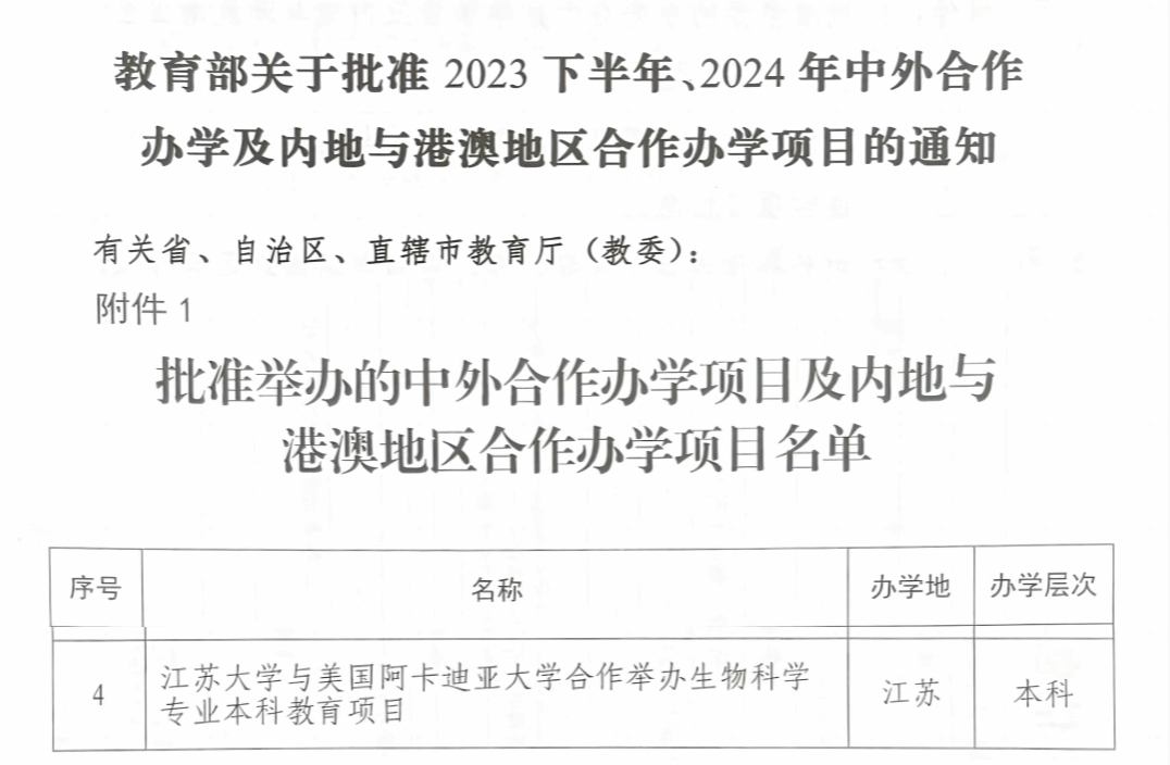 5月9日,教育部公布2025年经审核的中外合作办学机构和项目名单。开运体育平台官方网站与美国阿卡迪亚大学合作举办的生物科学专业本科教育项目正式获批,这是我校在中外合作办学领域取得的又一重要突破。