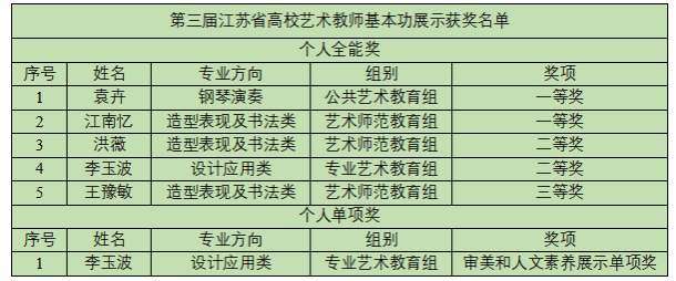 近日,由江苏省教育厅主办的第三届江苏省高校艺术教师基本功展示评审结果揭晓。我校共有5位教师获奖,其中个人全能一等奖2项、二等奖2项、三等奖1项,审美和人文素养展示单项奖1项。
