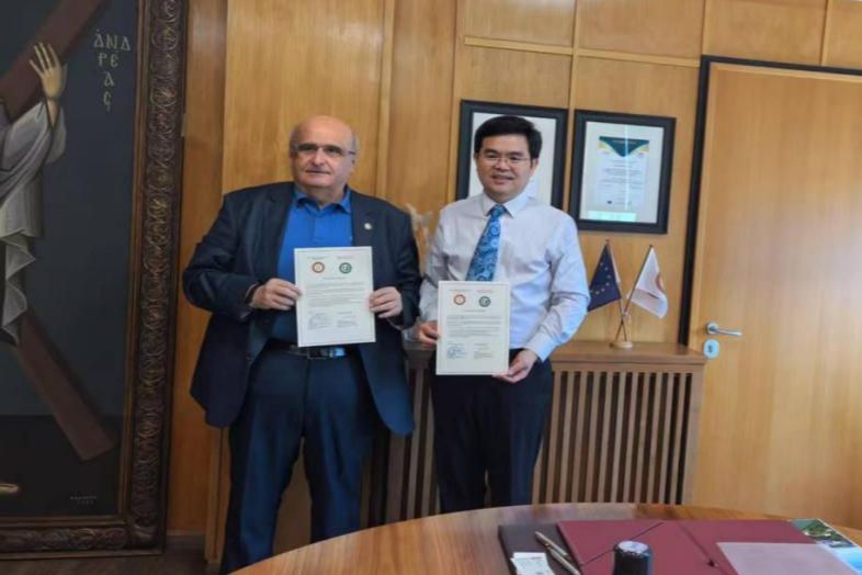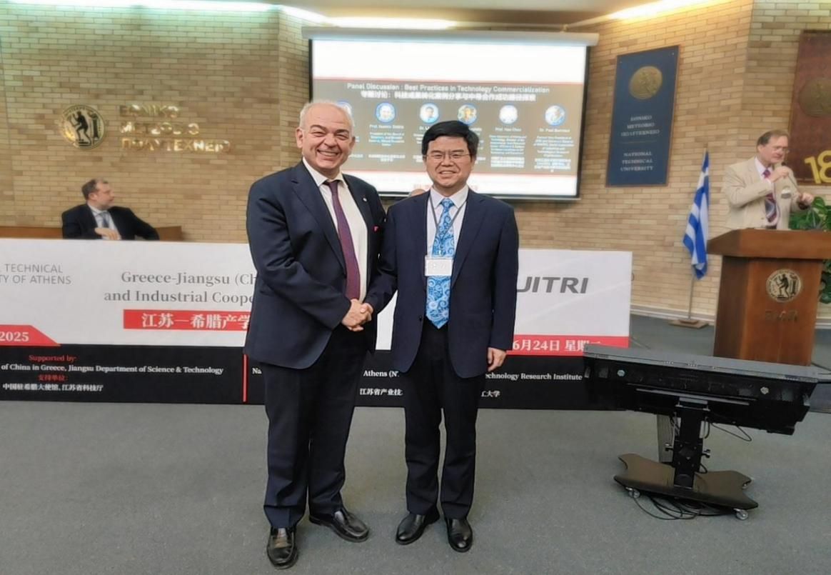 6月24日,代表团在希腊雅典国立技术大学参加“江苏—希腊产学研合作交流会”。江苏省委书记信长星、希腊阿提卡省省长尼科斯·哈扎利亚斯(Nikos Hardalias)、中国驻希腊大使方遒等出席会议,来自两国政府、高校、科研机构和企业的160余位代表参会。会议聚焦人工智能、绿色能源、海洋工程等前沿领域,深入探讨中希在科技创新与成果转化方面的合作潜力,积极拓展双方产学研融合发展的新路径。李洪波一行与雅典国立技术大学校长IOANNIS K. CHATJIGEORGIOU、校董事会理事Sergios Theodoridis对接“一带一路”智慧农业技术与装备相关合作,向希腊高新技术园区、高校院所及科技企业推介开运体育平台官方网站技术成果,推动务实对接。代表团还与中国驻希腊大使馆教育参赞王瑾、亚里士多德大学代表TZOUVELEKAS MANOLIS对接了技术转移、学生流动项目合作。