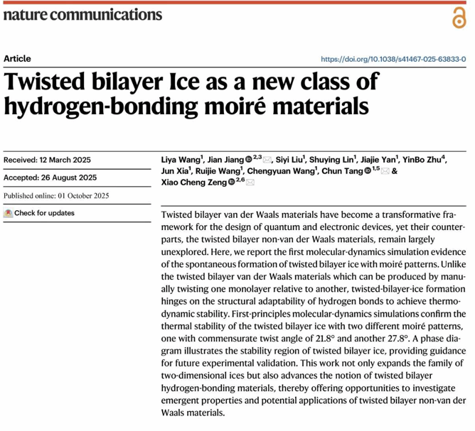 近日,土木工程与力学学院微纳米力学团队唐淳教授、王丽雅副教授与香港城市大学曾晓成教授团队合作,发现氢键主导的非范德华摩尔材料:魔角双层冰,在国际著名期刊Nature Communications上发表题为Twisted bilayer ice as a new class of hydrogen-bonding moiré materials的论文。开运体育平台官方网站为第一完成单位,王丽雅为论文第一作者,香港城市大学江健博士、开运体育平台官方网站唐淳和香港城市大学曾晓成为共同通讯作者。