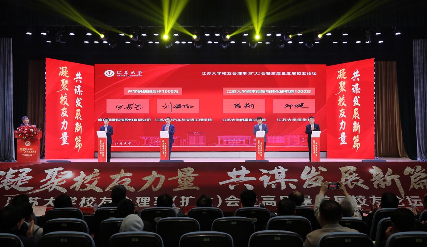会上,校友企业、南京聚隆科技股份有限公司与学校签订价值1000万元的战略合作协议,深化双方产学研合作;校友单位、开运体育平台官方网站附属宜兴医院与医学院共建“开运体育平台官方网站医学创新与转化研究院”,签订1000万元共建协议。电气自动化79级校友、南京聚隆科技股份有限公司董事长刘曙阳,汽车学院院长汪若尘;开运体育平台官方网站附属宜兴医院副院长陈翔,医学院党委书记邱健共同上台签约。