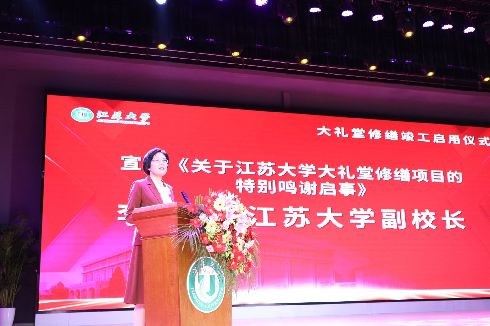 副校长李红宣读了大礼堂修缮项目特别鸣谢启事,对以江苏同创建筑装饰有限责任公司等为代表的34家集体和个人表示特别鸣谢。