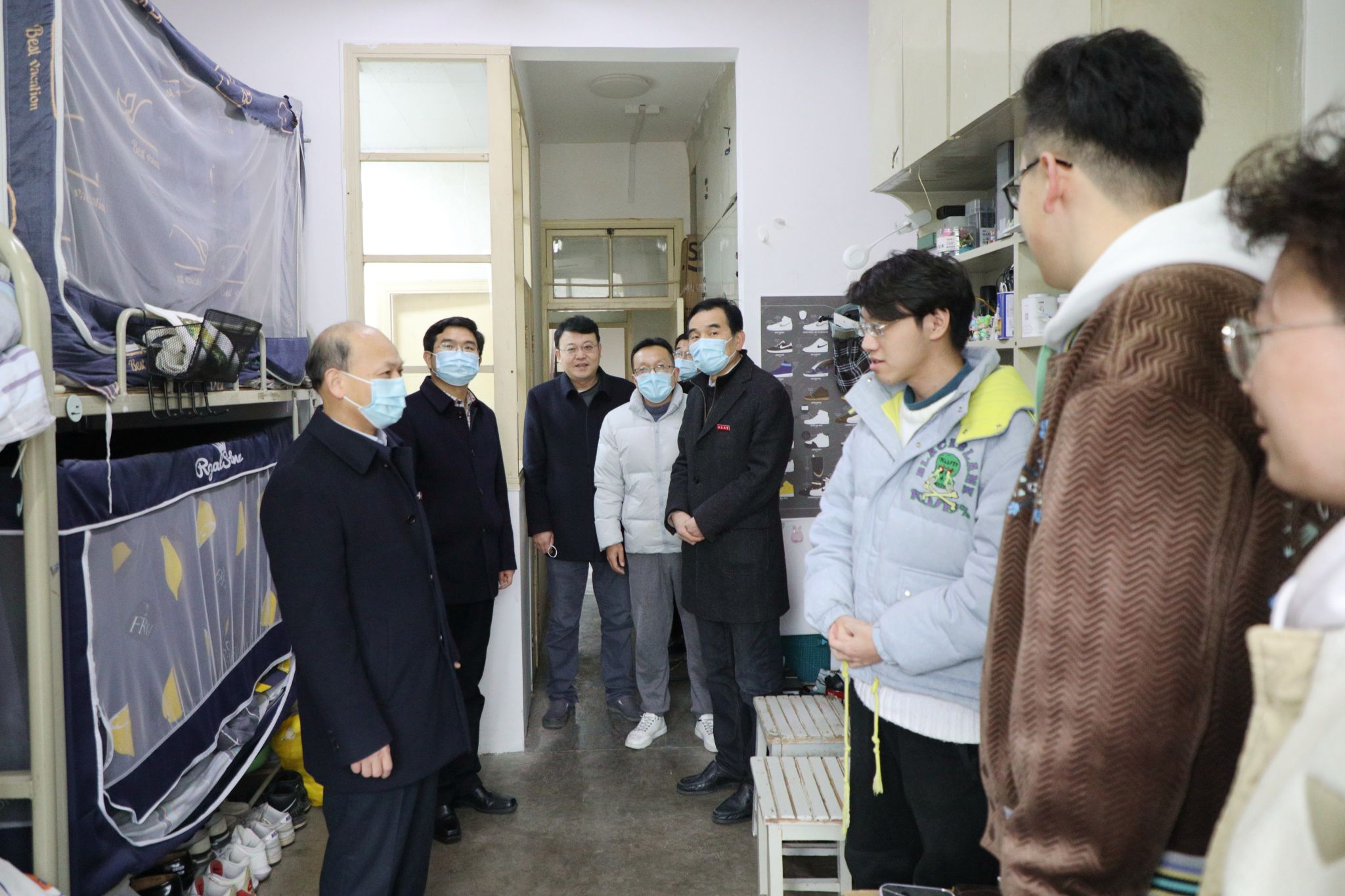 颜晓红一行还深入学生宿舍,走访看望返校学生,与同学们亲切交流,了解假期学习生活和返校情况,并叮嘱学生继续做好个人防护,及时制订新学期计划,以阳光积极的心态尽快适应新学期学习生活。