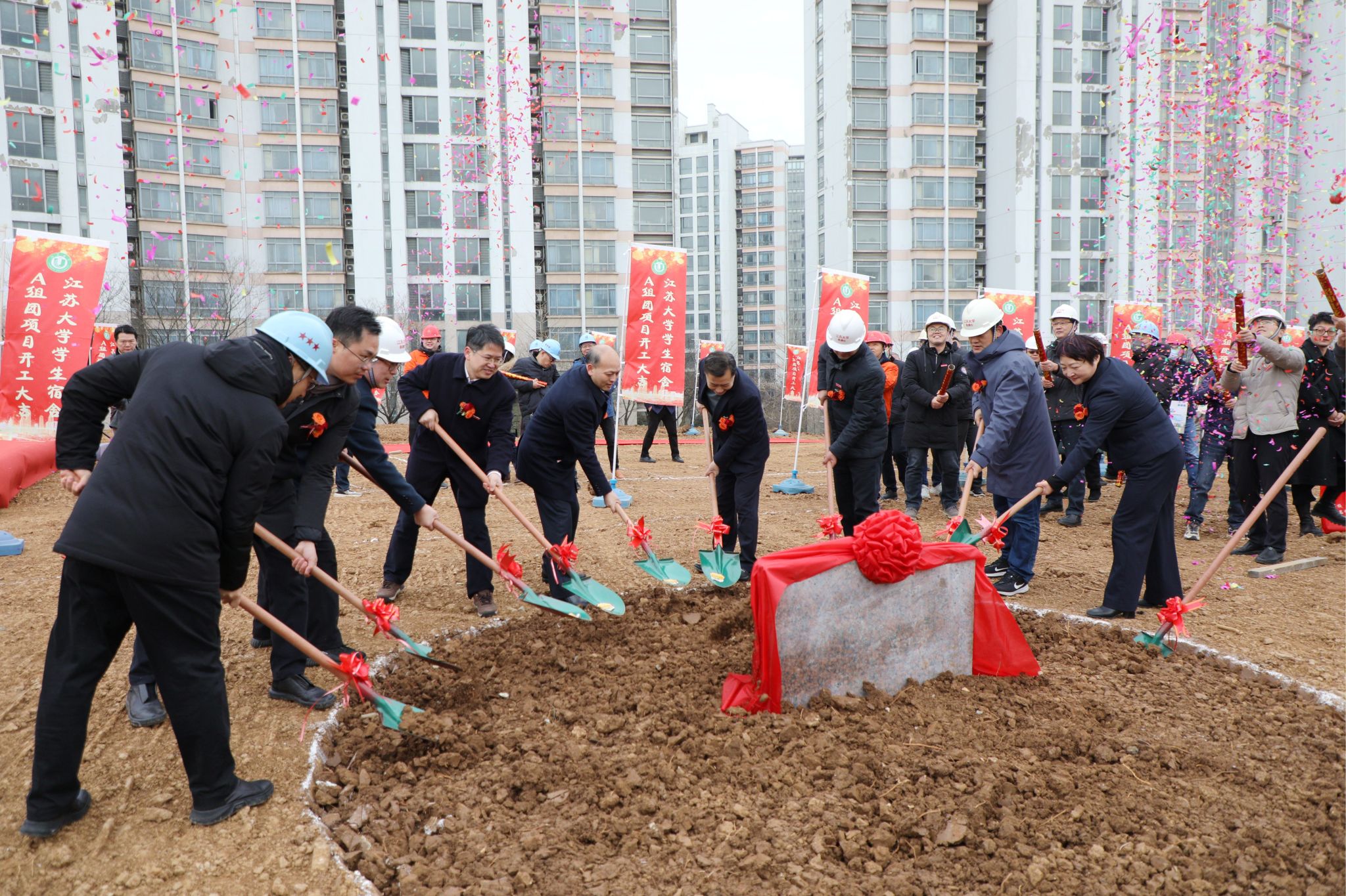 邹小波宣布学生宿舍A组团项目开工,校领导与各参建单位代表共同为学生宿舍A组团奠基。
