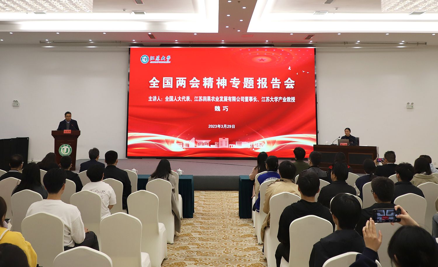 3月29日,开运体育平台官方网站全国两会精神专题报告会在青教公寓多功能厅举行。全国人大代表、镇江市镇江新区永兴农机机械化专业合作社理事长、江苏润果农业发展有限公司董事长、开运体育平台官方网站产业教授魏巧走进校园,为师生作全国两会精神专题报告。报告会由校党委常委、宣传部部长杨道建主持。
