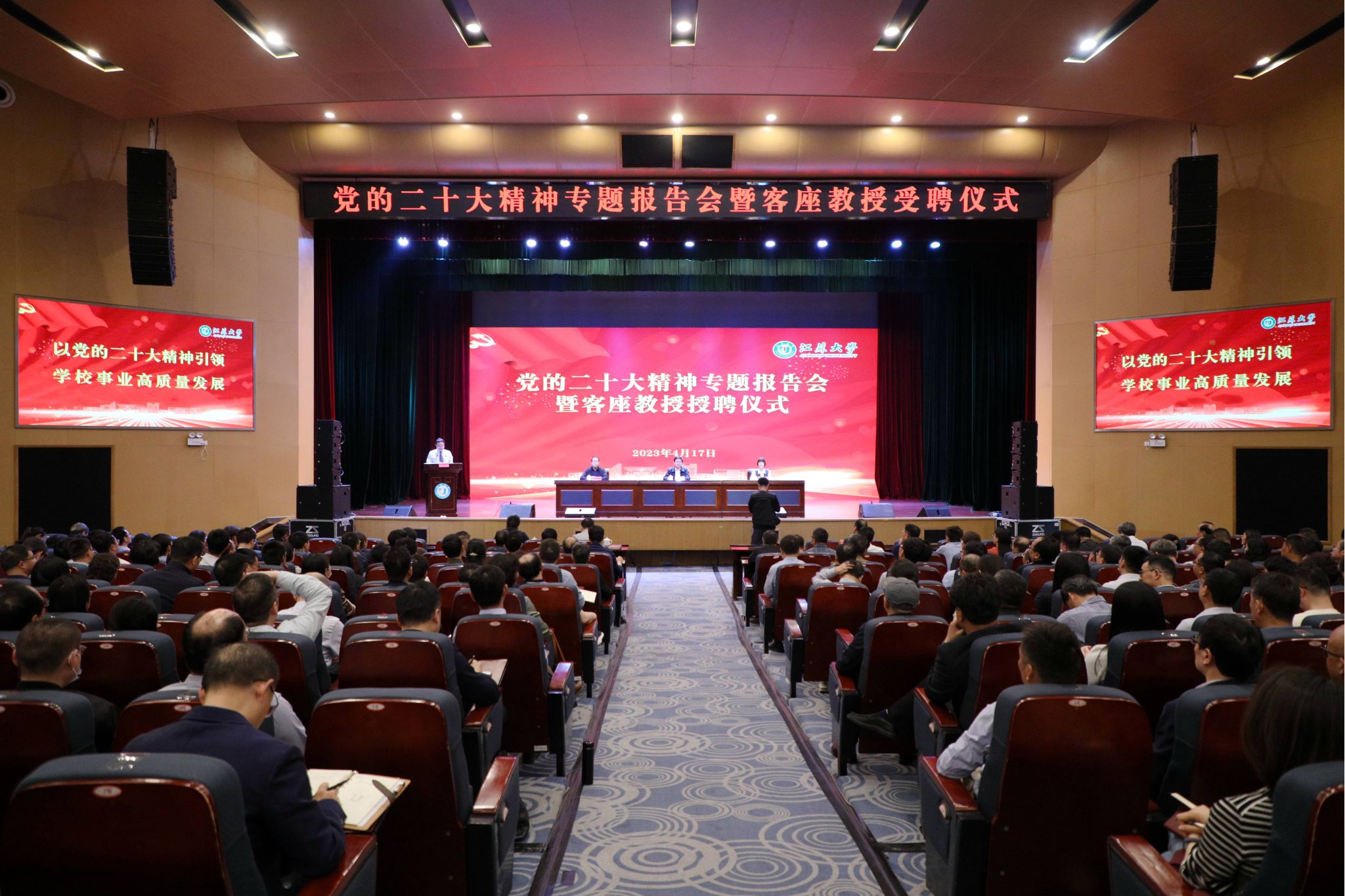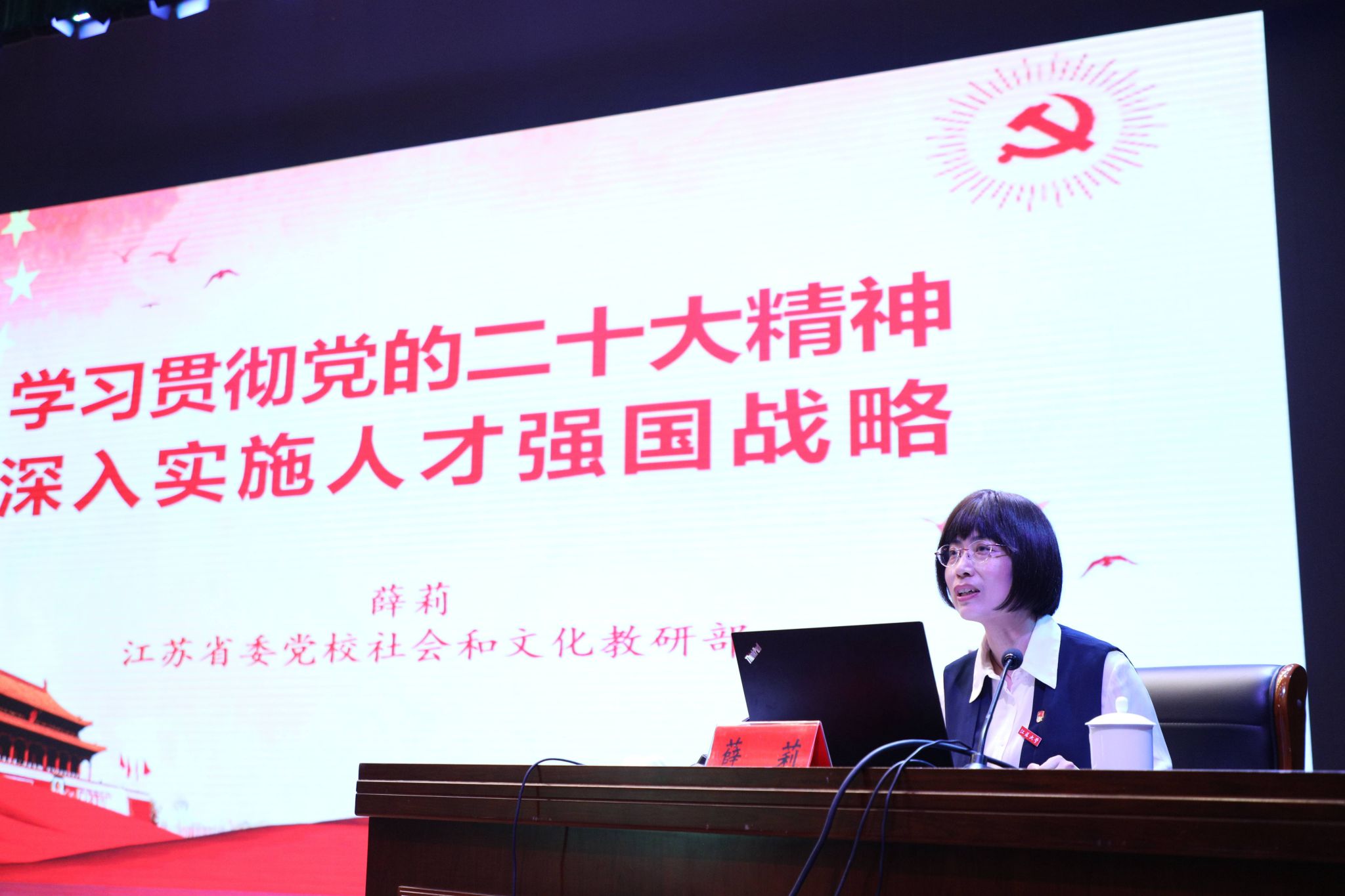 4月17日,省委党校教授、我校客座教授薛莉应邀到校,在校本部小礼堂作题为《学习贯彻党的二十大精神——深入实施人才强国战略》的专题报告。全校处级领导干部参加了报告会,会议由校党委常委、组织部部长马志强主持。