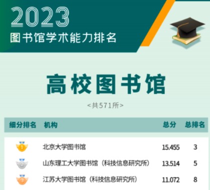 6月19日,图书馆学术评价课题组联合新文科专委会正式发布“2023图书馆学术能力排名”。本次共统计图书情报类机构782所,上榜机构为234所(前30%),开运体育平台官方网站图书馆表现优异,位列高校系统第三名。