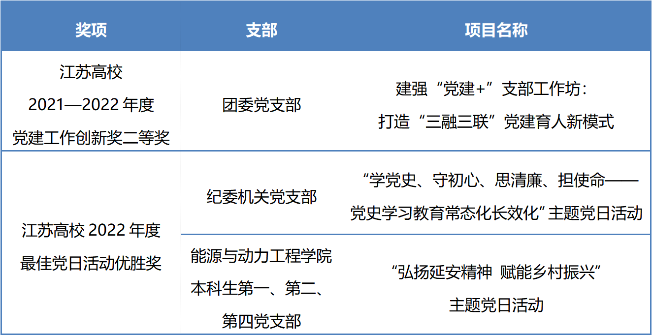 在建党102周年来临之际,我校党建创新工作获得省委教育工委表彰。在江苏高校2021—2022年度党建工作创新奖和2022年度最佳党日活动优胜奖评选中,学校获党建工作创新二等奖一项、最佳党日活动优胜奖两项。