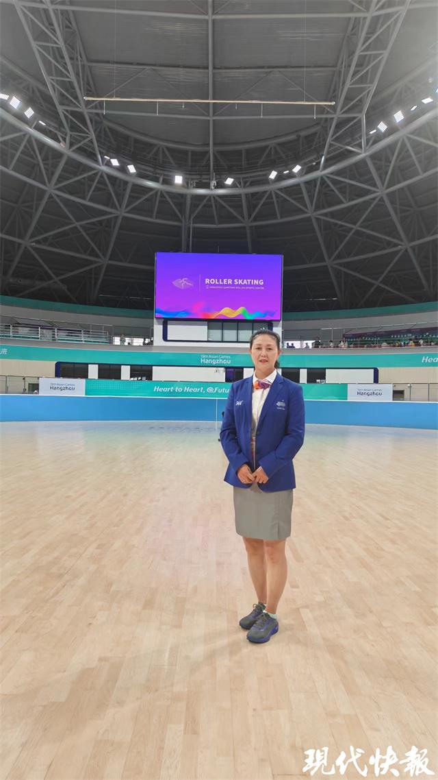 在本届杭州亚运会上,胡玉芹以 ITO(国际技术官员)的身份亮相速度轮滑赛场。