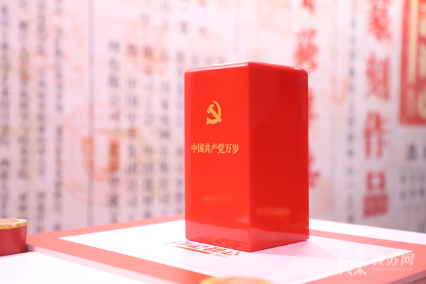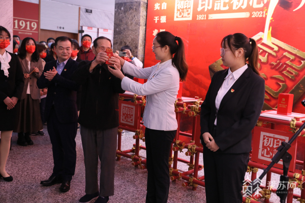 开幕式上,还举行了本次展览主题印章递交传递仪式。一枚用钢水浇铸而成,印坯通体铸有“海水江崖纹”,采用党旗红、党徽金配色寓意中国共产党人钢铁般坚强的革命意志和沉甸甸的历史使命与担当的“印记初心”主题印章,在近60年党龄的90岁退休教师杨光元、管理学院党委书记王丽敏、材料科学与工程学院研究生张瑜的手中依次转递,象征着全体老中青党员接续传承中国共产党人的初心使命和奋斗精神。