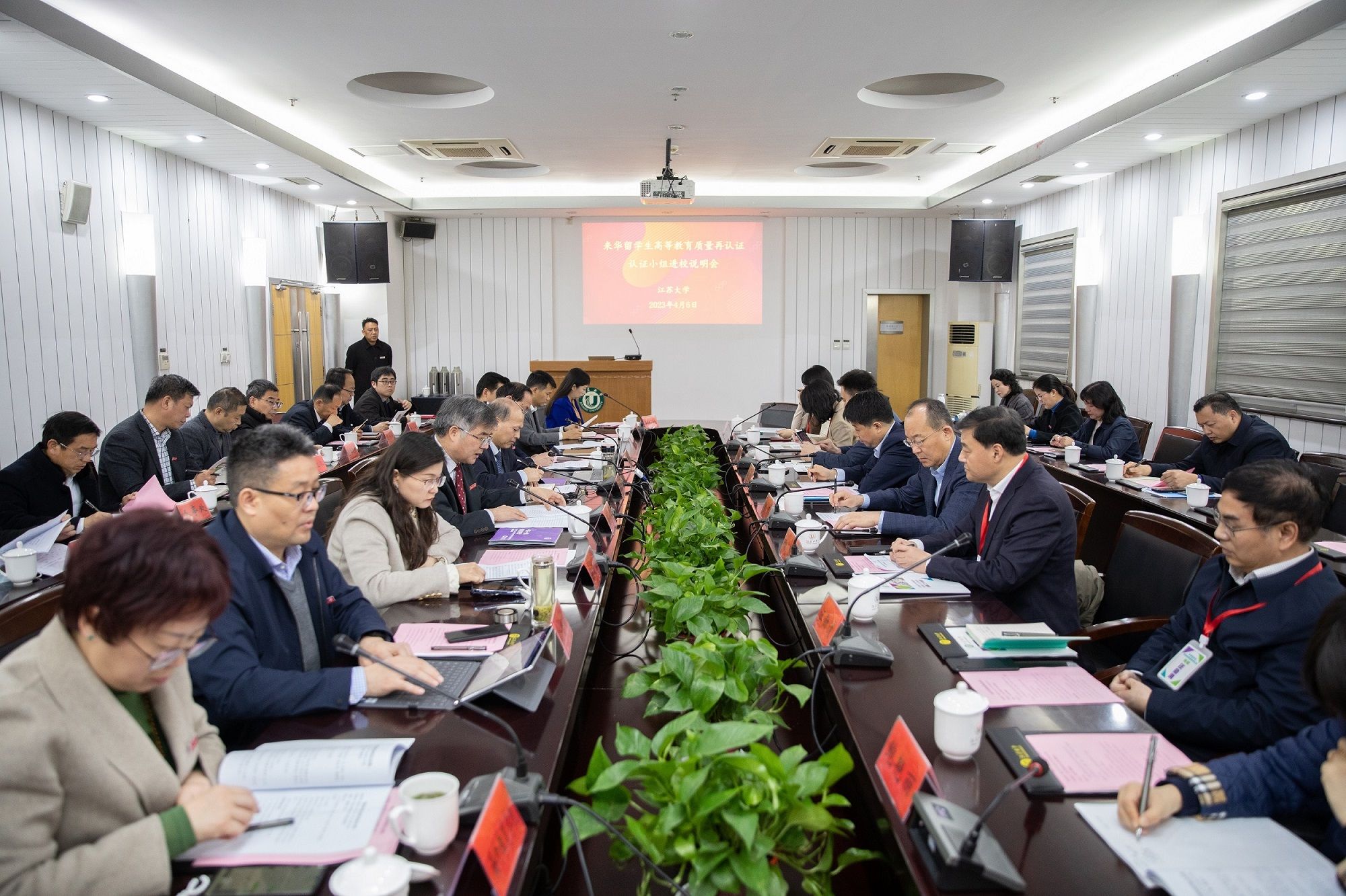 4月6日,在专家组进校说明会上,中国教育国际交流协会秘书处正司级副秘书长宗瓦、教育服务认证部主任翟金鸣,再认证专家组组长、中南大学国际合作与交流处处长白毅,专家组成员张伟、汪勋清、李晓娜、鲍艳丽、宗欣,江苏省教育厅对外合作与交流处副处长汝益仙,校党委书记袁寿其,校长颜晓红出席会议,会议由副校长赵玉涛主持。校教育国际化工作领导小组留学生工作组成员,代表性留学生培养单位负责人,国际处、海外教育学院、语言文化中心中层干部参会。