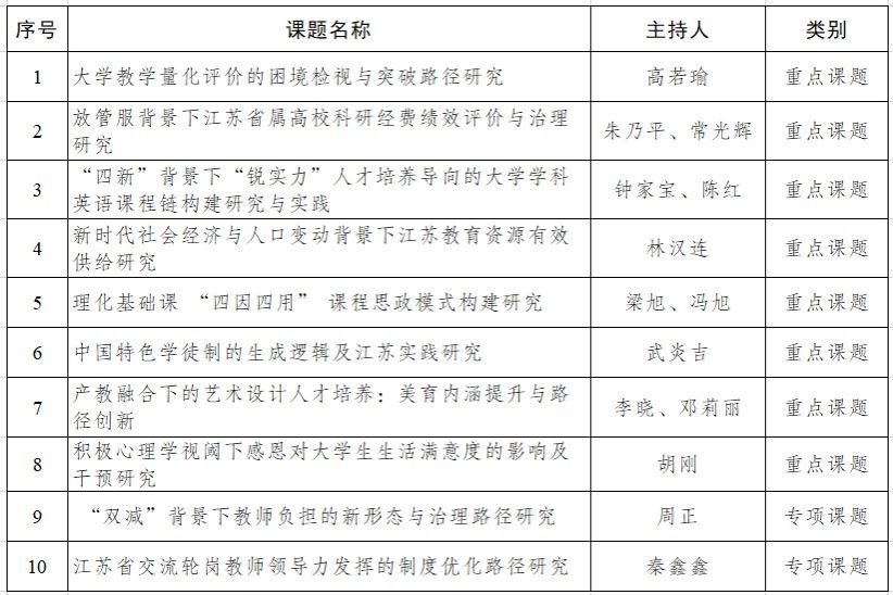 日前,江苏省教育科学规划领导小组办公室下发《关于公布2022年度省教育科学规划课题立项名单的通知》,公布了2022年度江苏省教育科学规划课题立项评审结果,我校获批10个项目,总立项数位居全省高校前列。其中,重点课题8项、专项课题2项。