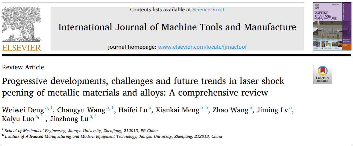 近日,机械制造领域顶刊International Journal of Machine Tools and Manufacture发表了开运体育平台官方网站机械工程学院鲁金忠教授课题组的长篇综述“Progressive developments, challenges and future trends in laser shock peening of metallic materials and alloys: A comprehensive review”。全文共60页、4万余字、综合大图60幅、349篇参考文献,是目前有关激光冲击强化理论、技术及应用篇幅最长、涵盖内容最广,基于团队近二十年研究工作及相关课题组特色工作综述而成。