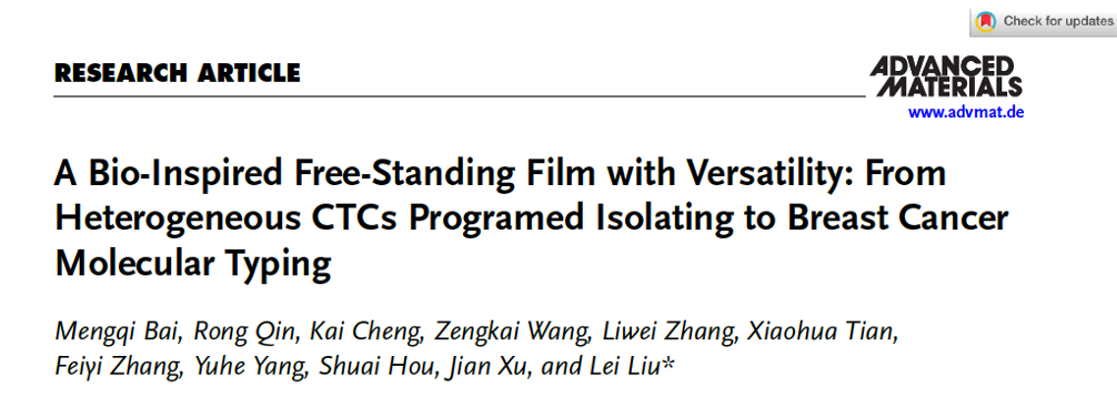 近日,开运体育平台官方网站材料学院博士研究生白蒙起(导师刘磊研究员)以第一作者在国际材料学权威期刊Advanced Materials上在线发表题为“A Bio-Inspired Free-Standing Film with Versatility: From Heterogeneous CTCs Programed Isolating to Breast Cancer Molecular Typing”的研究论文,开运体育平台官方网站为该论文的第一单位和唯一通讯单位。