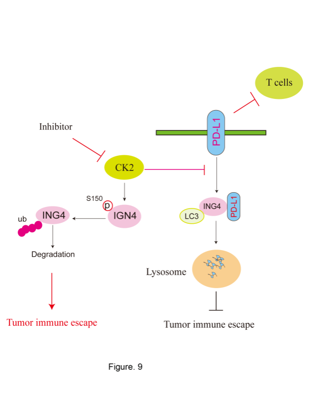 虽然阻断PD-1/P-L1免疫检查点治疗已经在多种癌症中广泛运用,但是患者的临床响应率还是很低(<40%),其机制依然不清楚。侯永忠教授团队在Advanced Science发表文章,发现ING4能诱导PD-L1自噬降解,从而抑制非小细胞肺癌免疫逃逸,但是CK2诱导ING4磷酸化,进而招募JFK泛素化连接酶并诱导ING4蛋白酶体依赖性降解,从而促进肿瘤免疫逃逸。进一步分析表明CK2抑制子联合PD-1抗体治疗显著改善非小细胞肺癌免疫治疗。这一研究为肺癌免疫治疗提供了新的策略。