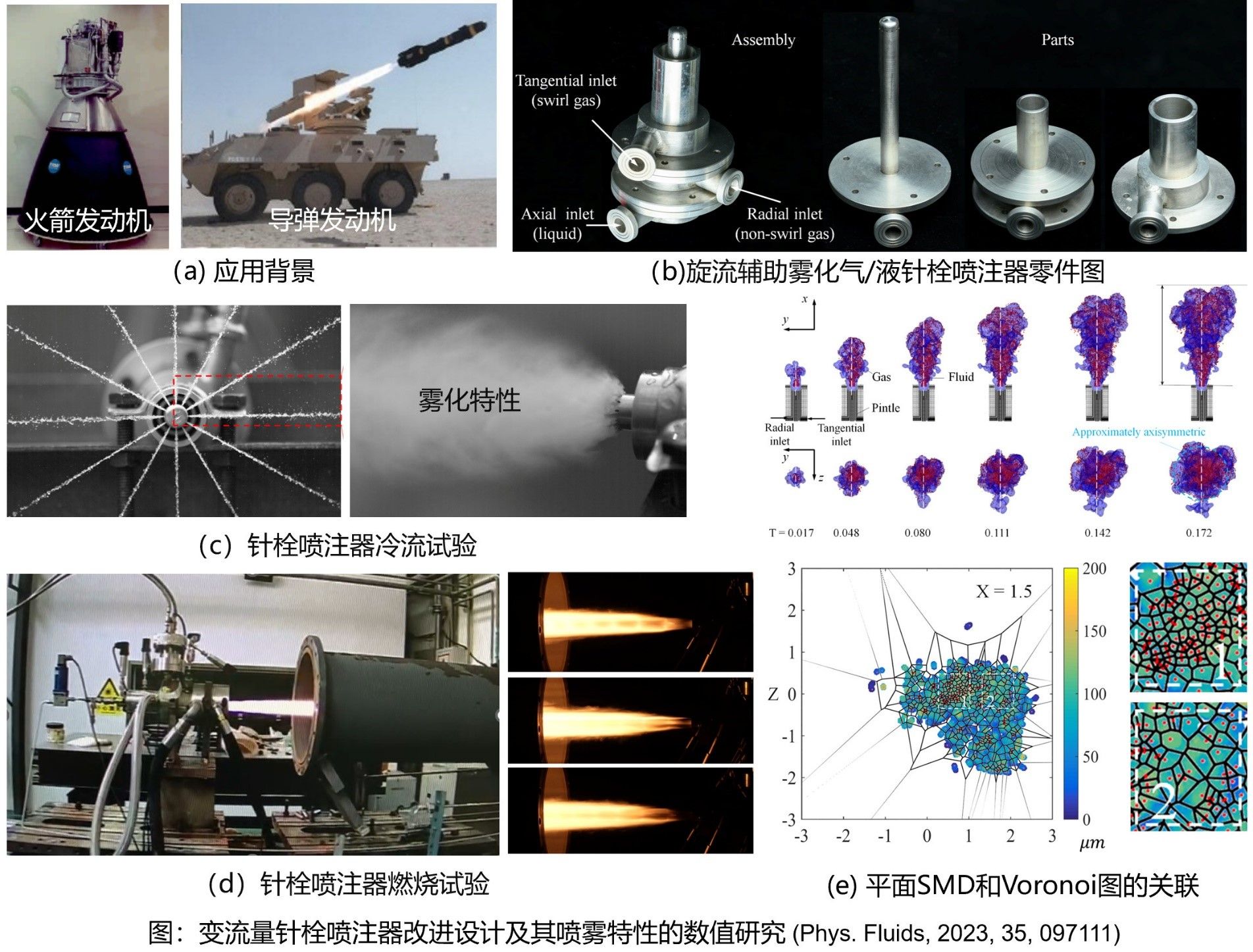 先进动力系统研究所何成明特聘教授团队在Physics of Fluids发表研究论文,提出了一种旋流辅助雾化且旋流度可调的气液针栓喷注器设计,利用旋流在周向的剪切作用辅助雾化,同时通过控制无旋和有旋的气流质量实现旋流度的可调。本文对该改进设计进行了实验和数值研究,验证了旋流喷注对雾化和燃烧特性的改善,研究了不同旋流度对喷雾和燃烧特性的影响。分别从SMD和Voronoi图两方面表征喷雾,两者耦合才能构造出完整的液滴群燃烧亚网格模型,对后期研究喷雾燃烧数值模拟提供理论指导。