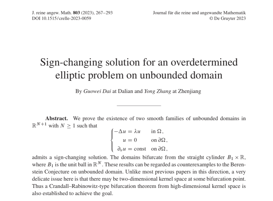 张勇老师联合大连理工大学代国伟教授在Journal für die reine und angewandte Mathematik(Crelle's Journal)发表论文,利用分歧分析方法构造出非平凡无界柱形区域上超定特征值问题变号解,从而给出Berenstein猜想在无界区域上的反例。