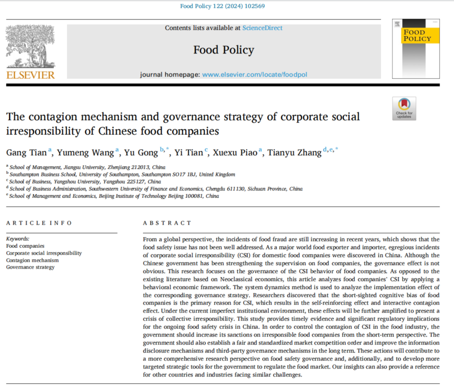 田刚教授在Food Policy发表论文,基于行为经济学框架分析了食品企业失责行为(CSI)的传染机制,并通过系统动力学仿真探明了相应治理策略的实施效果。研究发现,食品企业的短视认知偏差是CSI的核心原因,导致CSI存在自我强化效应和交互传染效应。在当前不完善的制度环境下,这些效应将进一步放大,并呈现出群体不负责任的危机。这项研究为中国持续的食品安全危机提供了及时和重要的政策含义。