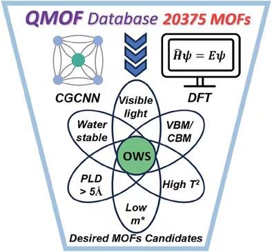 颜晓红、陈元平教授团队在Advanced Functional Materials上发表文章,提出了一种将机器学习与高通量第一性原理计算结合的数据驱动方法,以识别具有全光解水功能的金属有机网络。通过系统地评估水稳定性、带隙、能带位置、电荷载流子传输和光学吸收特性等因素,从包含超过20000个MOF系统的数据库中确定了14个作为可全光解水MOF的候选者,且其中五个系统具有优于已报道的电子和光学性能。该工作代表了对基于MOF的水分解光催化剂的大规模、数据驱动的探索,揭示了MOF光催化尚未开发的潜力。