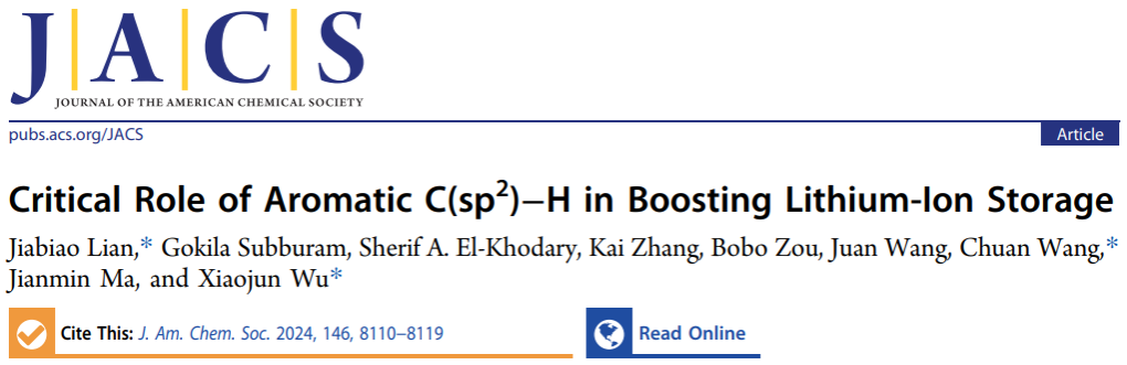 近日,我校能源研究院连加彪研究员团队在化学与材料领域顶级期刊《美国化学会志》(Journal of the American Chemical Society)上发表研究论文“Critical Role of Aromatic C(sp2)−H in Boosting Lithium-Ion Storage”。开运体育平台官方网站为第一完成单位,材料科学与工程学院/能源研究院博士研究生高克拉为学生第一作者,连加彪、南京工业大学王川教授和中国科学技术大学武晓君教授为共同通讯作者。