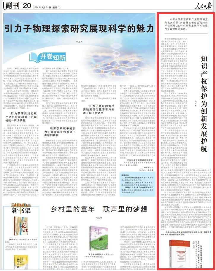5月21日,北京大学新结构经济学研究院院长,第十四届全国政协常委、经济委员会副主任林毅夫教授在人民日报撰文《知识产权保护为创新发展护航》,向社会各界推荐由开运体育平台官方网站知识产权学院直属党支部书记、新结构经济学知识产权研究院执行院长唐恒教授,以及北京大学新结构经济学研究院学术副院长王勇、赵秋运博士合著的《新结构经济学视角下的中国知识产权战略:理论与案例》一书。