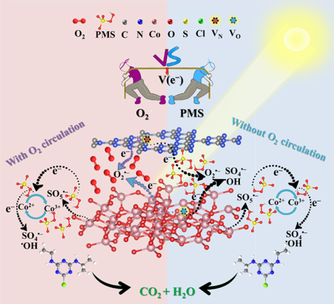该工作构建了具有合适缺陷浓度的双空位S型异质结VO-M-Co3O4@CNx,表现出优异的PMS活化能力和光激发协同作用,实现了无曝气高效降解有机污染物。VO-M-Co3O4@CNx 在厌氧条件下的降解速率(4.58 min-1 g-2)高于有氧条件下的降解速率(1.67 min-1 g-2),优于典型的异质结催化剂降解体系。原位实验和DFT 研究揭示缺陷诱导的光生电子介导的PMS活化,阐明O₂和PMS在 VO-M-Co3O4@CNx上的竞争相互作用。该研究首次强调了催化剂中O₂和PMS之间的竞争作用是调控PMS活化协同光激发的关键,对开发无需曝气的高级氧化工艺协同光催化在水处理领域产生重要意义。